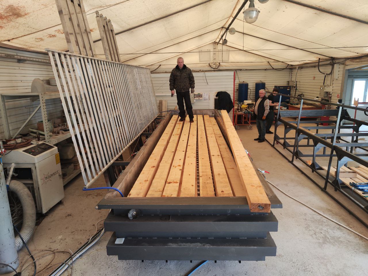 Пресс-вакуумные сушильные камеры для древесины — это тип сушильного оборудования, в котором процесс вакуумной сушки сочетается с механическим давлением, создаваемым за счет вакуума. В этих камерах древесина помещается между нагревательными плитами, и за счет созданного вакуума обеспечивается прижим древесины к нагревательным плитам, что обеспечивает прямой тепловой контакт. Этот метод значительно ускоряет процесс сушки, обеспечивает более равномерное распределение влаги и минимизирует риск деформаций и растрескивания. Пресс-вакуумные камеры особенно эффективны для сушки твердых пород дерева и толстых пиломатериалов, где важна высокая скорость и качество сушки.